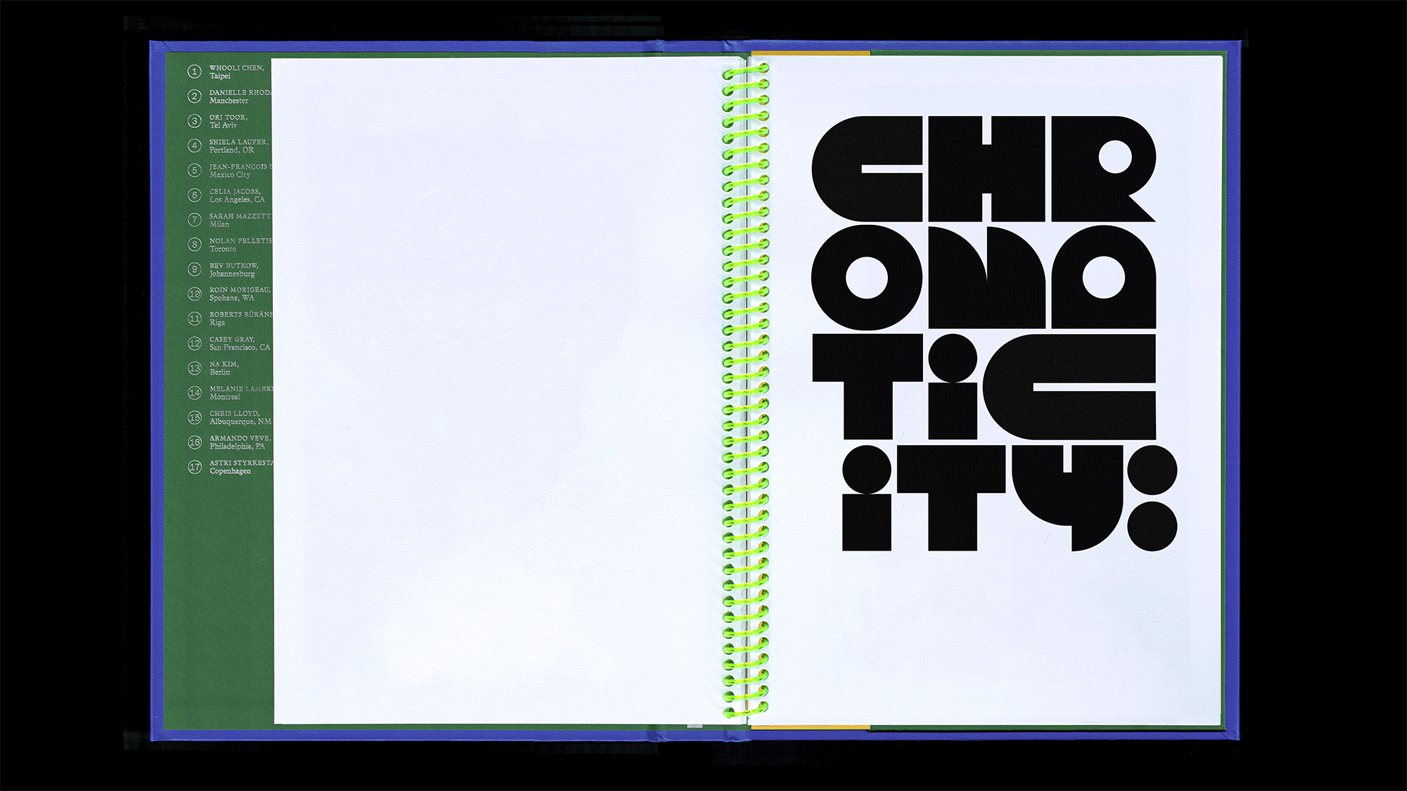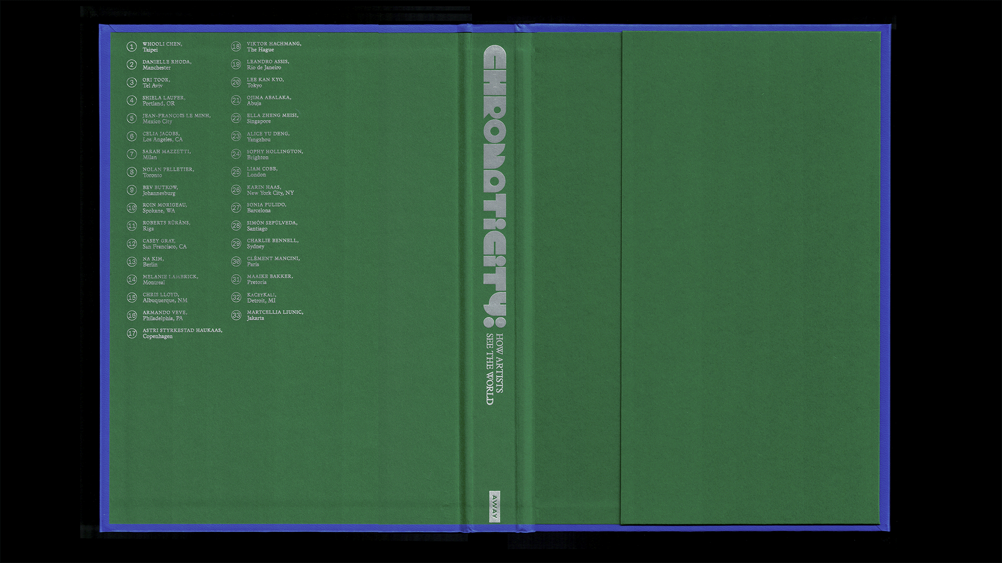 Chromaticity celebrates artists and cities around the world. Its 100 pages are organized in a color wheel, showcasing 33 contributing artists including Armando Veve, Na Kim, Sophy Hollington, Ori Toor, Viktor Hachmang, and Lee Kan Kyo. Colors were selected and named by the artists, to best represent their home cities—everywhere from Tokyo to Brighton, Riga to Detroit, Abuja to Tel Aviv. Limited run of 800 copies. Custom display type.