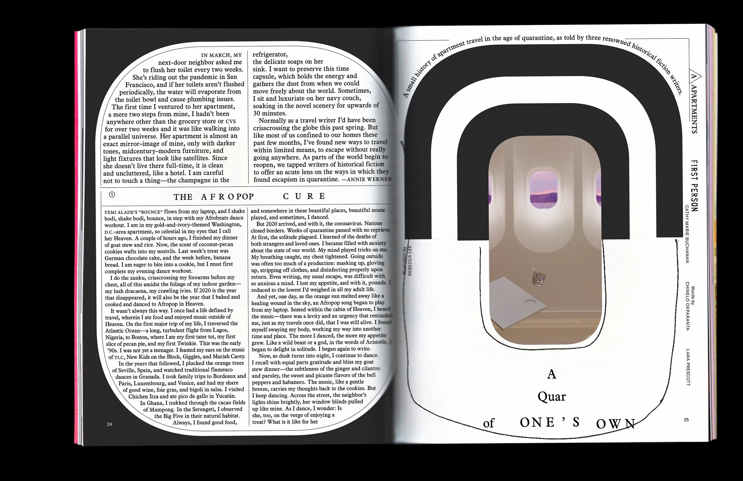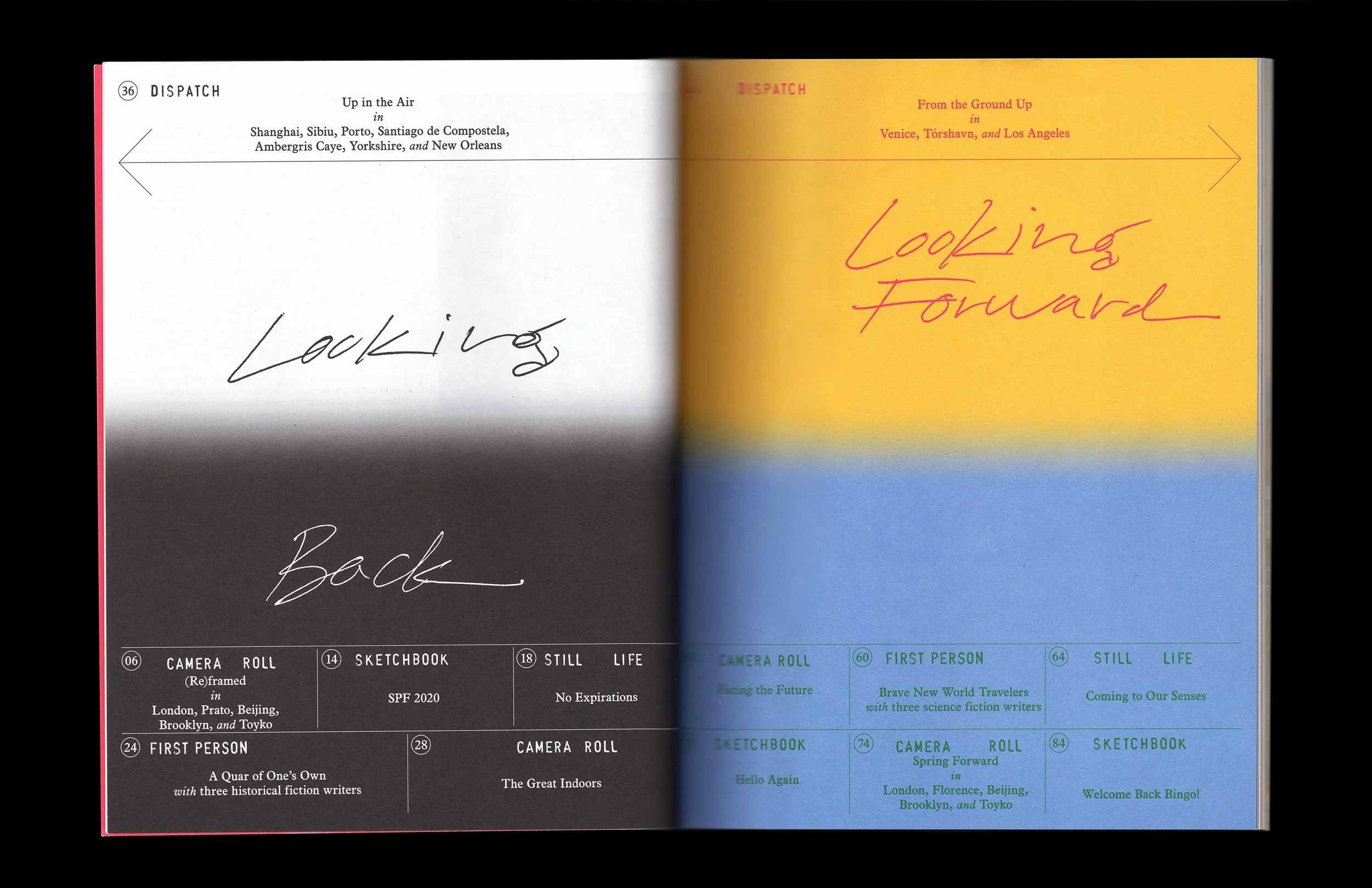 Photographers from New York, London, Beijing, Tokyo, and Florence reflect on lockdown and springtime in their cities; writer Sarah Sax reports how COVID-19 devastated the hospitality industry; three historical fiction authors look back on their lives in quarantine; three science fiction writers dream up post-pandemic travels; photographer Stephanie Gonot takes us on a world tour through non-perishables; and illustrator Cory Feder reminisces on international greetings.