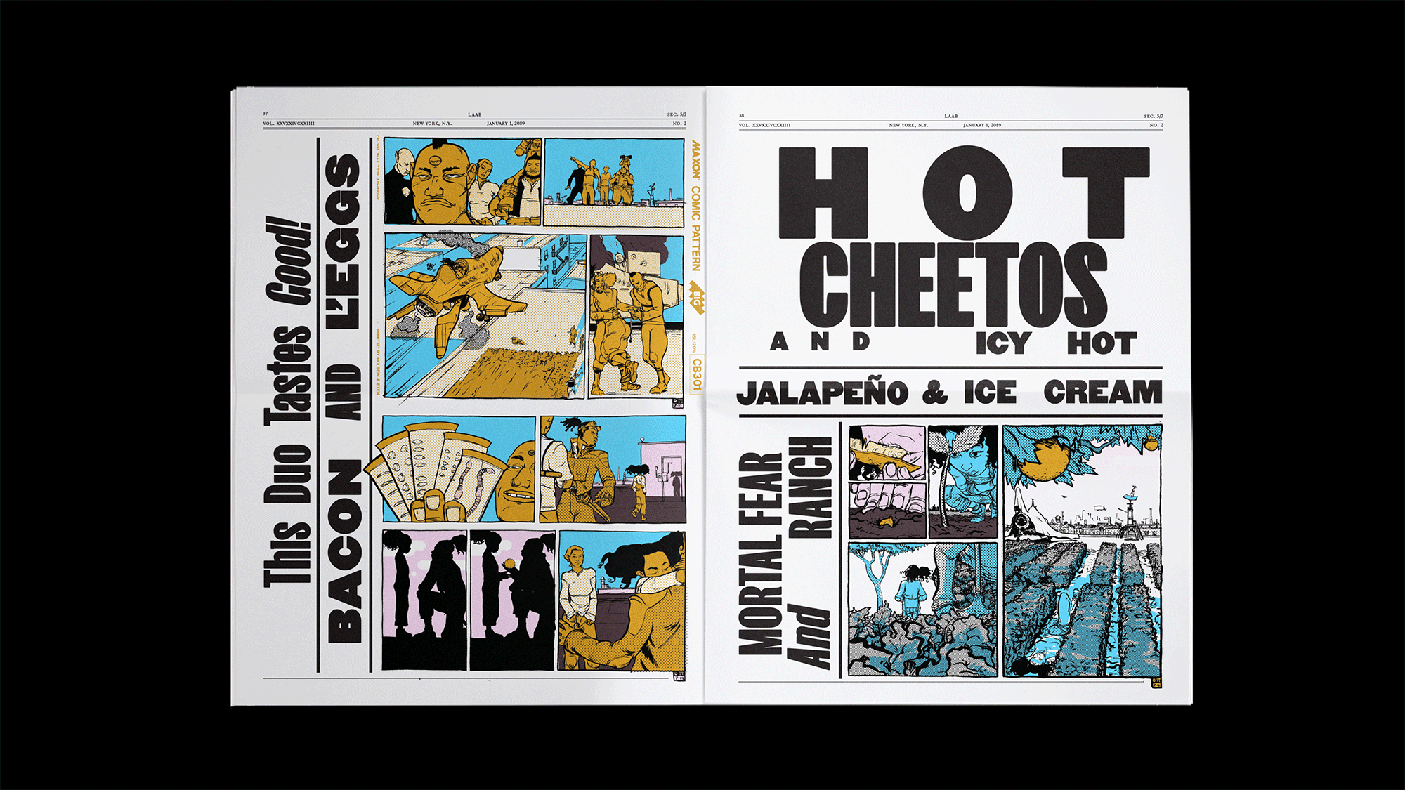Sequencing, visual language, and layout of the third issue (LAAB numbering is non-sequential) of graphic artist Ronald Wimberly's art newspaper. Eat/Shit explores consumption, from composting to cultural appropriation, and includes interviews with Tunde Adebimpe, Steve Brill, and Stephen Torton, and essays by Michael Metivier and Kim Jooha. Contributing artists include Michael DeForge, Paul Pope, Gideon Kendall, Tracy Chahwan, Miranda Tacchia, Frank Nikol, and many others.