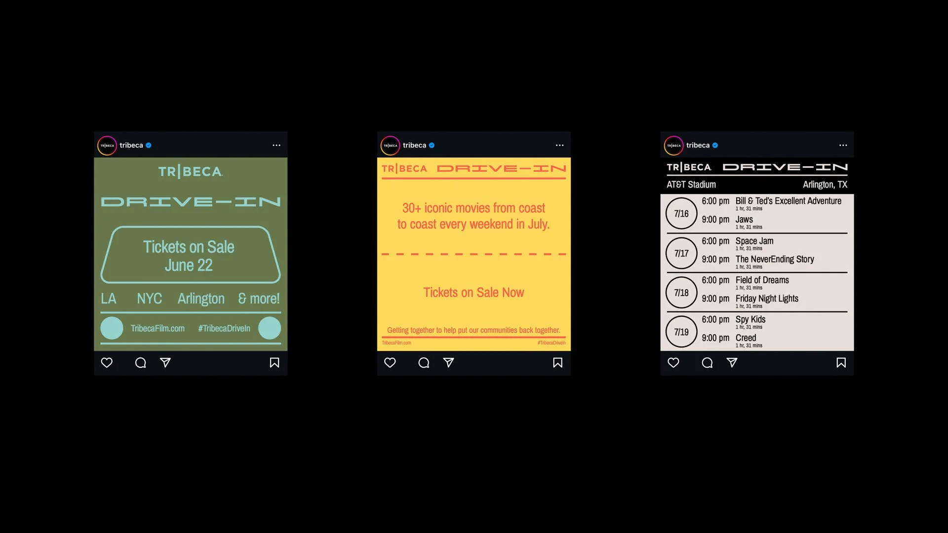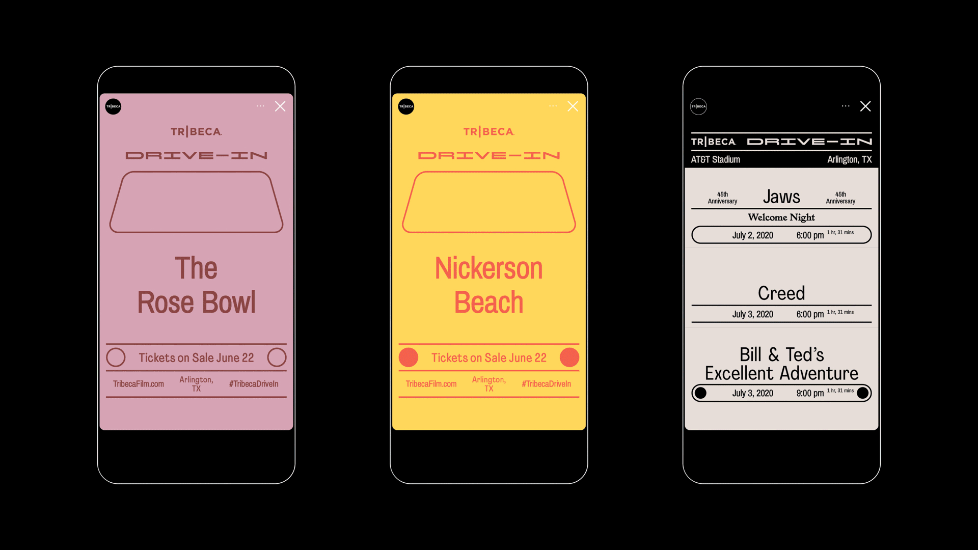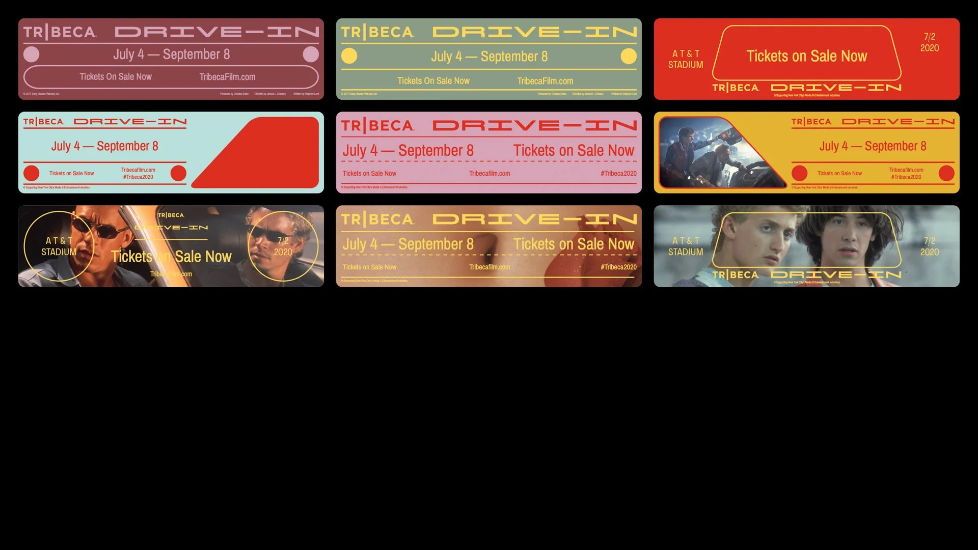 Contemporary-retro brand identity for Tribeca Film Festival’s drive-in series, which launched as a pandemic-friendly alternative to their annual film festival. Outdoor theaters in New York, Los Angeles, and Dallas showed blockbusters from June to August 2020.